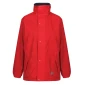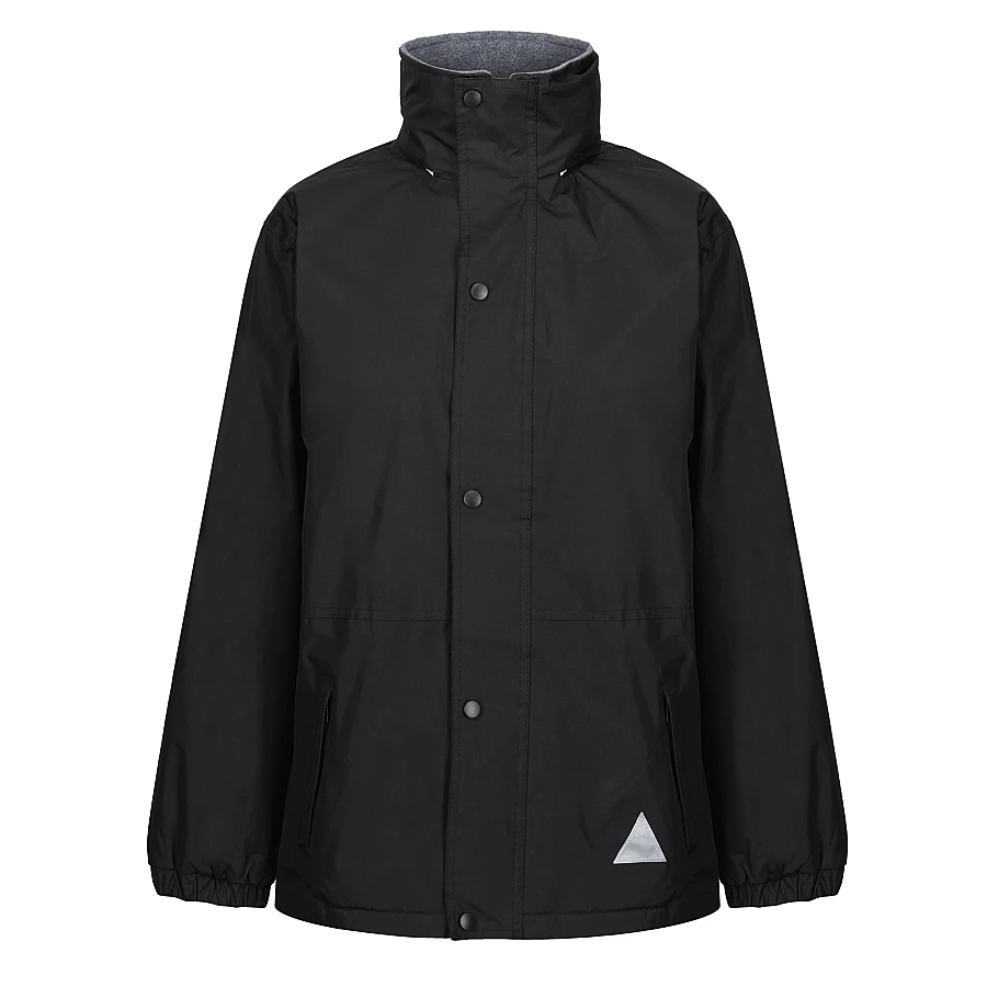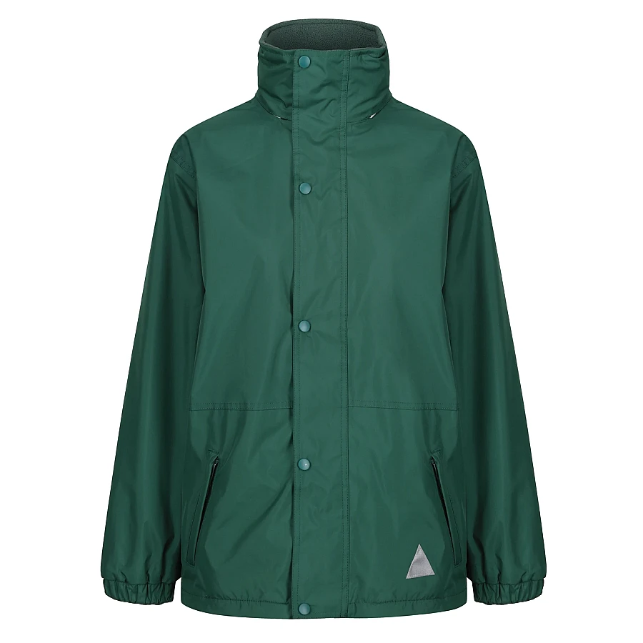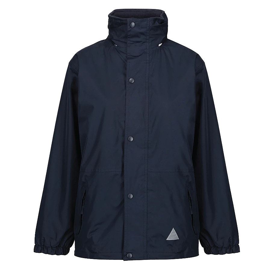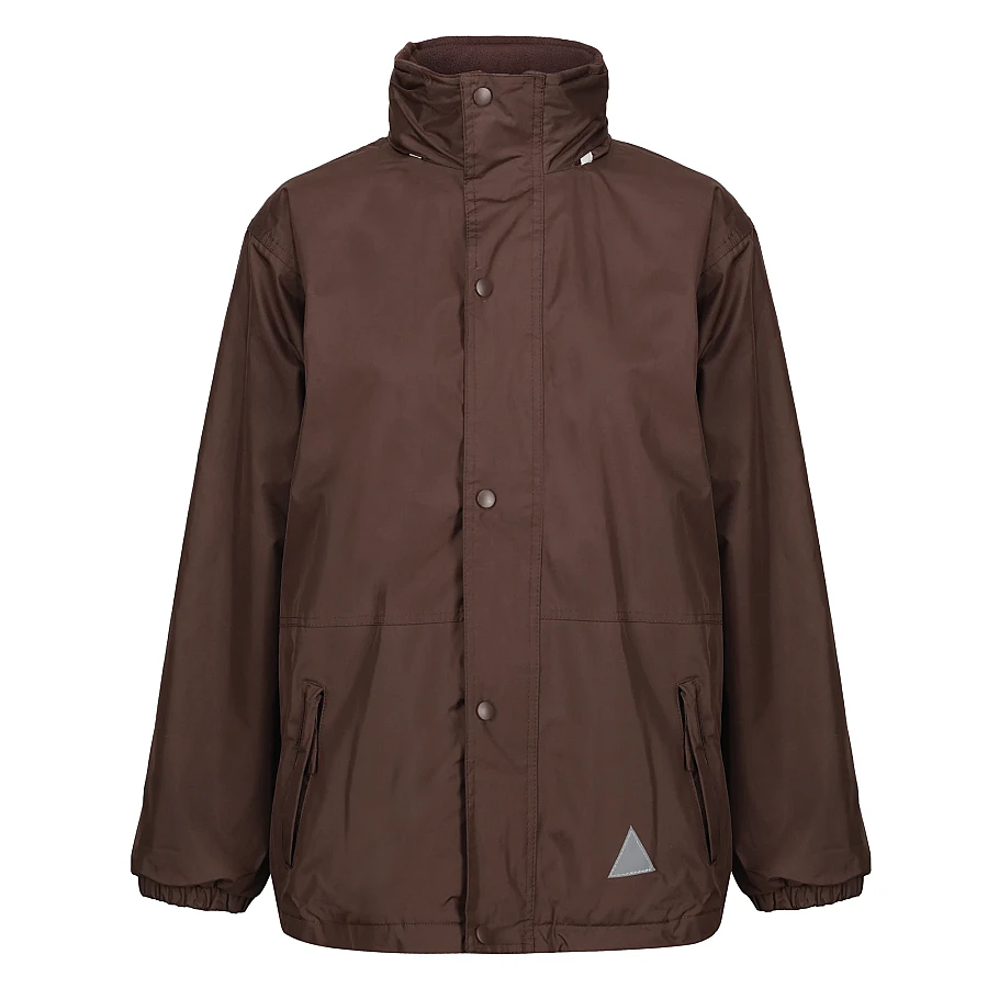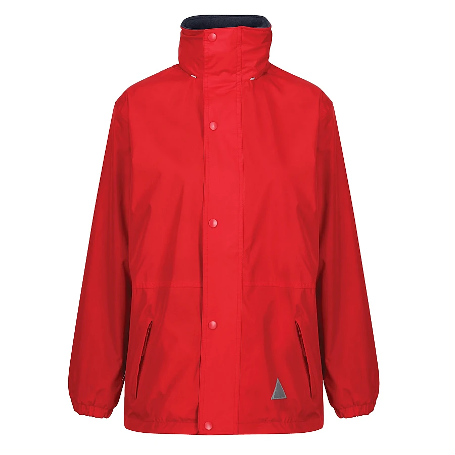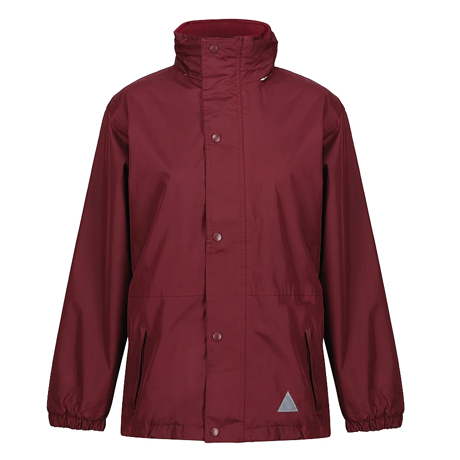 A reversible weatherproof coat with a foldaway hood.